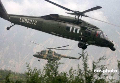 5月22日是汶川大地震的第十一天,成都軍區(qū)陸航團密集飛行,空降帳篷等救災急需物資到受災嚴重的高山羌寨。中新社發(fā) 賈國榮 攝