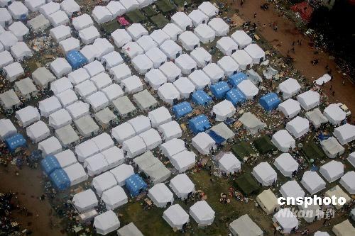 5月22日是汶川大地震第十一天,縣城中的廣場上建起白色救災帳篷區(qū)。中新社發(fā) 賈國榮 攝