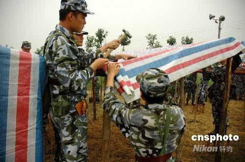 5月25日,中國海軍陸戰(zhàn)隊某旅官兵為四川綿竹市東北鎮(zhèn)赤竹村受災民眾緊急搭建簡易住房。汶川大地震發(fā)生后,四川綿竹市東北鎮(zhèn)赤竹村房屋幾乎被夷為平地,財產(chǎn)損失頗為嚴重。中國海軍陸戰(zhàn)隊從24日起開始為村里搭建簡易住房。中新社發(fā) 李唐 攝