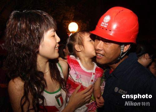 5月25日晚,湖南婁底市電業(yè)局赴四川重災(zāi)區(qū)綿竹市和什邡市抗震救災(zāi)一線的第一批20名搶修勇士,在圓滿完成抗震救災(zāi)保電任務(wù)后,勝利返回湖南婁底市。中新社發(fā) 郭國權(quán) 攝