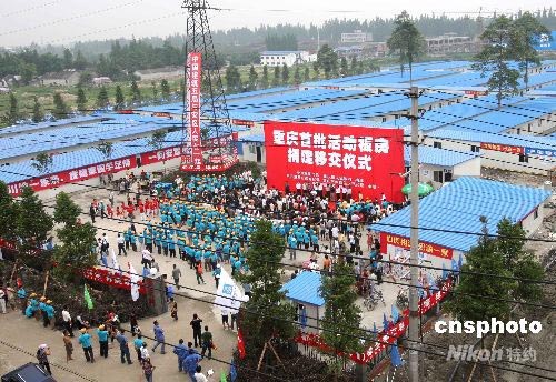 由重慶市政府捐助、南岸區(qū)承建的一萬平方米、500套輕型結(jié)構(gòu)活動(dòng)保暖住房5月27日在四川都江堰落成,數(shù)千都江堰受災(zāi)民眾將于近日入住,成為“重慶村”一員。中新社發(fā) 趙振清 攝