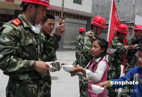 武警交通直屬工程部經(jīng)過(guò)6天奮戰(zhàn),5月27日終于打通了臥龍至“孤島”耿達(dá)的“生命線”,各種給養(yǎng)補(bǔ)給車(chē)輛開(kāi)進(jìn)被與世隔絕的重災(zāi)區(qū)耿達(dá)鎮(zhèn),當(dāng)?shù)孛癖姼兄x武警官兵。中新社發(fā) 江胡 劉亞軍 攝