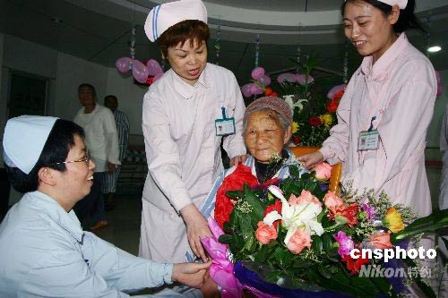 6月1日,四川北川縣災(zāi)區(qū)曲山鎮(zhèn)井夾山村99歲的杜銀珍老人在重慶市第二人民醫(yī)院十四病區(qū)醫(yī)務(wù)人員的精心打扮下,滿面笑容接受人們的百歲生日祝福。據(jù)了解,在5.12汶川大地震時(shí),杜銀珍老人背著重孫在廚房做飯,廚房垮塌后,強(qiáng)大的沖擊波將她一下推出5米多遠(yuǎn),摔到在院壩里。后在孫媳婦的攙扶下趕了10里山路才碰到救援部隊(duì),被送到綿陽(yáng)市中醫(yī)院。5月19日轉(zhuǎn)至重慶市第二人民醫(yī)院接受治療。中新社發(fā) 陳仕川 攝