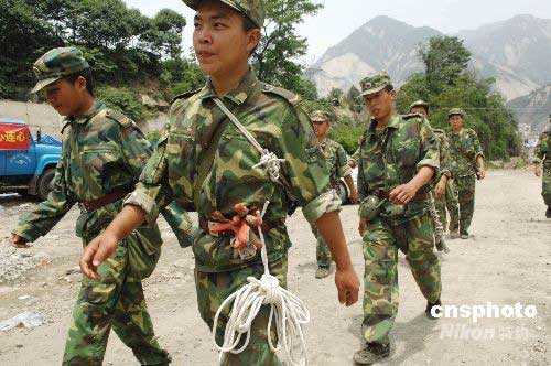 6月2日下午,多支解放軍部隊官兵調集四川映秀山區(qū),加大地面搜尋失事直升機力度。圖為一工兵部隊在連續(xù)搜尋數十個小時未果后進行“換防”。5月31日下午,成都軍區(qū)抗震救災部隊一架米-171運輸直升飛機在執(zhí)行運送第三軍醫(yī)大學防疫專家到理縣的任務返回途中,因局部氣候變化,突遇低云大霧和強氣流,于14時56分在汶川縣映秀鎮(zhèn)附近失事。中新社發(fā) 陳文 攝