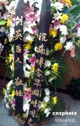 8月22日,解放軍305醫(yī)院設(shè)置悼念原中共中央主席華國(guó)鋒的靈堂,社會(huì)各界人士前往悼念。據(jù)悉,將從當(dāng)天起進(jìn)行3天的公眾悼念活動(dòng)。華國(guó)鋒因病醫(yī)治無效于8月20日12時(shí)50分在北京逝世,享年87歲。圖為葉帥后人所送花圈。中新社發(fā) 韓凱 攝