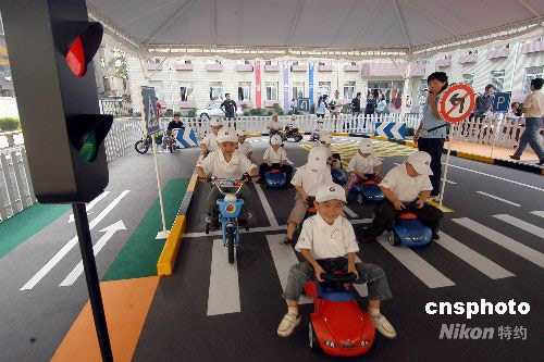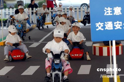 9月11日,為期三天的2008BMW兒童交通安全訓練營沈陽站在和平區(qū)少年宮開營。在BMW兒童交通安全主題公園里,十字路口、交通崗、紅綠燈、斑馬線、雙黃線、警示牌等一應俱全。來自沈陽多所幼兒園的80名孩子駕駛著玩具寶馬汽車、摩托車和自行車行駛在這一個“縮小版”的繁華街道上。中新社發(fā) 文契 攝