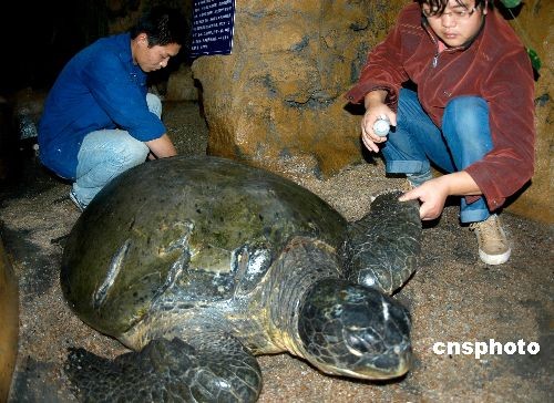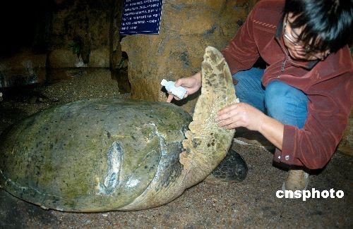 11月22日,綠海龜靜靜趴在溫度適宜的暫養(yǎng)池里,水族館技術(shù)人員用藥為它治療傷口。日前,江蘇連云港市連島水族館收治了一只巨型綠海龜,經(jīng)過幾日精心救治,這位超過100歲的老壽星會慢慢地將頭抬起來。據(jù)介紹,這只海龜長約160厘米,寬約100厘米,頭部、右前方和左后方龜蓋上有明顯傷痕,可能是在海水里被螺旋槳劃傷的,伸手觸摸可以摸到肉,在剛接來時右后腿還在流血,眼睛也受感染。水族館收治后,派三位專人悉心照料,待傷情恢復(fù)后再放歸大海。這只巨型綠海龜是贛榆縣宋莊鎮(zhèn)漁民在收網(wǎng)時無意中捉到的。中新社發(fā) 王春 攝