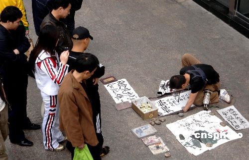12月4日,左手小臂以下被截肢,右臂高位截肢的廣西男子劉國(guó)強(qiáng),在福州鬧市街頭口含毛筆作畫(huà)掙錢(qián)。2002年,劉國(guó)強(qiáng)在農(nóng)村家里打谷發(fā)生意外導(dǎo)致雙手截肢,之后他開(kāi)始口銜毛筆寫(xiě)字作畫(huà)掙錢(qián)謀生。中新社發(fā) 王東明 攝