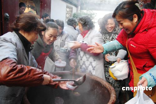 2009年1月3日,是中國(guó)傳統(tǒng)的“臘八節(jié)”,在中國(guó)民間有吃“臘八粥”的習(xí)俗。蘇州寒山寺向進(jìn)寺的市民免費(fèi)派送“臘八粥”,已成傳統(tǒng)。據(jù)悉,寒山寺當(dāng)日向市民提供“臘八粥”3800余公斤。中新社發(fā) 朱子寒 攝