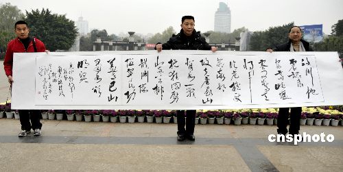 1月5日,一幅飽含地震災(zāi)區(qū)群眾深情的巨幅詩詞書法作品《唐家山頌》在四川省南充市創(chuàng)作完成。這幅作品寬5.12米,高0.8米,由南充市退休干部張?bào)w政撰稿,書法家何文軍以草書體創(chuàng)作成傳統(tǒng)書法藝術(shù)卷軸,以表達(dá)地震災(zāi)區(qū)群眾對(duì)廣大解放軍指戰(zhàn)員和武警官兵抗震救災(zāi)英雄壯舉的感激和敬仰之情。張?bào)w政、何文軍即專程把這幅飽含地震災(zāi)區(qū)群眾深情的詩詞書法作品送往北京。圖為飽含地震災(zāi)區(qū)群眾深情的詩詞書法作品《唐家山頌》。中新社發(fā) 肖洪環(huán) 攝