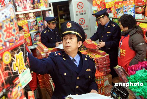 一月十九日,是北京2009年春節(jié)銷售煙花爆竹的首日,為保障市民安全歡度新春佳節(jié),西城工商執(zhí)法檢查人員對(duì)首日開始銷售的市場進(jìn)行檢查。中新社發(fā) 任海霞 攝