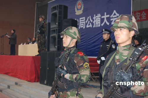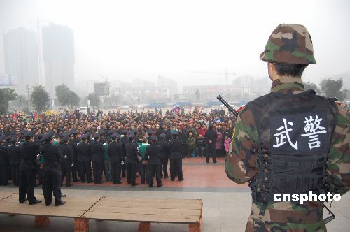 1月19日,四川岳池對縣城系列賓館盜竊案、鎮(zhèn)龍鄉(xiāng)故意傷害案、九龍鎮(zhèn)搶奪案、羅渡鎮(zhèn)販賣毒品案等15件涉嫌犯罪案件所涉及的30名犯罪閑疑人進行了公開逮捕,吸引了近萬名群眾觀看。中新社發(fā) 胡佐斌 攝
