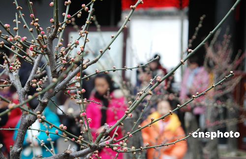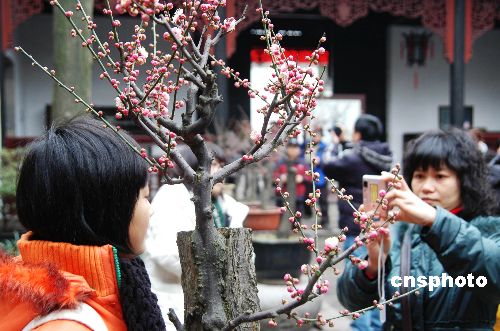 2009年1月20日,蘇州園林“迎春梅花展”在獅子林內(nèi)開(kāi)幕,百余件造型各異的紅、綠、雪梅和劈梅老樁盆景,吸引許多觀眾。中新社發(fā) 朱子寒 攝