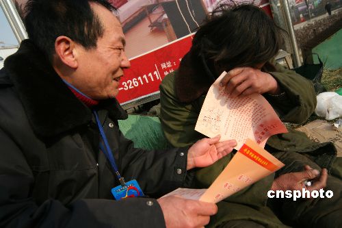1月22日,許昌市救助管理站的工作人員在救助一個(gè)生活無(wú)著人員。春節(jié)即將到來(lái),為更好地向困難群體獻(xiàn)愛(ài)心、送溫暖,不讓一個(gè)生活無(wú)著人員流落街頭,當(dāng)日,河南省許昌市救助管理站開(kāi)展“迎新春社會(huì)關(guān)愛(ài)生活無(wú)著人員”活動(dòng),對(duì)符合救助條件的求助者,無(wú)償提供食宿、幫助聯(lián)系親屬等。這次活動(dòng)除與各區(qū)縣救助站同時(shí)開(kāi)展宣傳、咨詢活動(dòng)外,還會(huì)派流動(dòng)小分隊(duì)走上街頭,對(duì)生活無(wú)著人員進(jìn)行勸導(dǎo),實(shí)施現(xiàn)場(chǎng)救助。中新社發(fā) 牛書(shū)培 攝