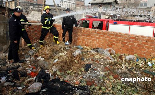連日,北京遇大風降溫天氣。為確保春節(jié)期間燃放煙花爆竹等消防安全,近日,北京崇文警方會同消防部門清理市民居住區(qū)內(nèi)各樓道及房前屋后的可燃物,拆除在消防通道上搭建的違章建筑,并派出消防車專門對前門地區(qū)重點部位、火災(zāi)隱患較為嚴重的院落實行人工降雨,確保春節(jié)期間消防安全。中新社發(fā) 胡建強 攝