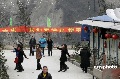 1月23日(臘月二十八),四川汶川縣映秀鎮(zhèn)在街頭吊掛起紅燈籠,給小鎮(zhèn)帶來(lái)了節(jié)日氣氛。連日來(lái),四川省藏族阿壩自治州汶川縣映秀鎮(zhèn)村民抓緊排練歌舞喜迎春節(jié)。中新社發(fā) 張曉理 攝