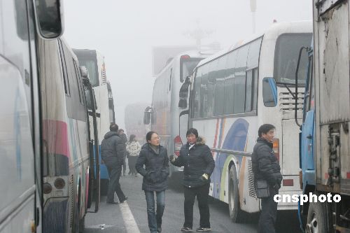 2009年2月1日上午,在同三高速公路江蘇省贛榆縣出口處,車輛等待霧散通行。連日來(lái),江蘇省大部分地區(qū)遭遇持續(xù)大霧天氣,部分地區(qū)能見(jiàn)度不足50米,給旅客出行及運(yùn)輸帶來(lái)影響。當(dāng)?shù)貧庀蟛块T發(fā)布大霧黃色預(yù)警,交通安全部門提醒旅客要注意出行安全。中新社發(fā) 司偉 攝