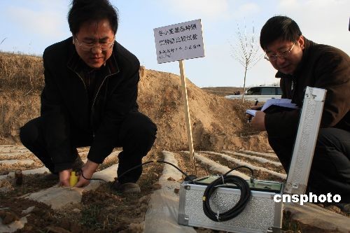 甘肅推廣小麥膜側(cè)種植技術(shù)抗旱保墑效果明顯。2月6日,農(nóng)業(yè)專家在甘肅省靜寧縣甘溝鄉(xiāng)測試冬小麥土壤濕度,這里實行了膜側(cè)種植、全膜覆蓋種植,既集雨,又保墑。多日來,實地測試結(jié)果顯示,實施這一技術(shù)的土壤墑情明顯好于普通露地。中新社發(fā) 殷春永 攝