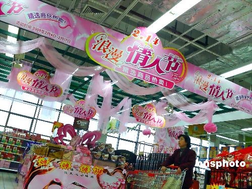 2月12日,上海一家超市內(nèi)布置的“情人節(jié)”浪漫專區(qū)。距離情人節(jié)還有兩天,上海商家的“甜蜜攻勢”已經(jīng)全面展開,有關情人節(jié)的各類商場布置和促銷禮盒已一一登場。中新社發(fā) 井韋 攝