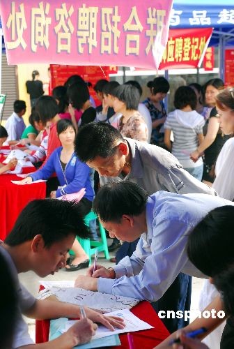 2009年2月16日,海南省就業(yè)局聯(lián)合大型零售企業(yè),在?、三亞、澄邁等全省8個(gè)市縣同時(shí)舉行針對(duì)弱勢(shì)群體的大型現(xiàn)場(chǎng)招聘會(huì),專門招收下崗職工、失業(yè)人員、零就業(yè)家庭人員、大中專畢業(yè)待業(yè)青年和農(nóng)民工。用人單位對(duì)聘用人員一律進(jìn)行培訓(xùn)上崗,無(wú)論哪個(gè)工種的工資,都不低于所在市縣的最低生活保障金,且到崗就給購(gòu)買各項(xiàng)保險(xiǎn)。中新社發(fā) 善平 攝