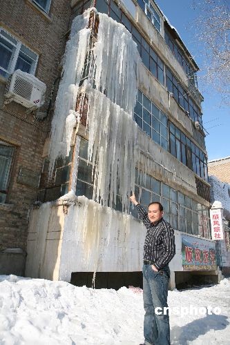 2月22日,在新疆阿勒泰市團結(jié)南路一居民樓上驚現(xiàn)壯觀的冰瀑奇觀,家住此樓的宋正國等四戶居民身受其擾。居民樓共四層冰瀑一直從三樓垂到一樓,十分壯觀。中新社發(fā) 唐曉波 攝