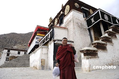 2月24日,藏歷年三十,拉薩哲蚌寺內(nèi)一位喇嘛背著大包年貨進入佛殿。中新社發(fā) 廖攀 攝