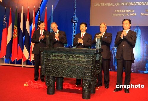 2009年2月26日,“萬國禁煙會”百年紀(jì)念活動在上海舉行,來自泰國、英國、美國、越南等16個國家的政府代表團以及聯(lián)合國毒品和犯罪問題辦公室、國際麻醉品管制局代表出席。中國國務(wù)委員、公安部部長孟建柱(中)與參會代表一起為“萬國禁煙會”百年紀(jì)念鼎揭幕。中新社發(fā) 湯彥俊 攝