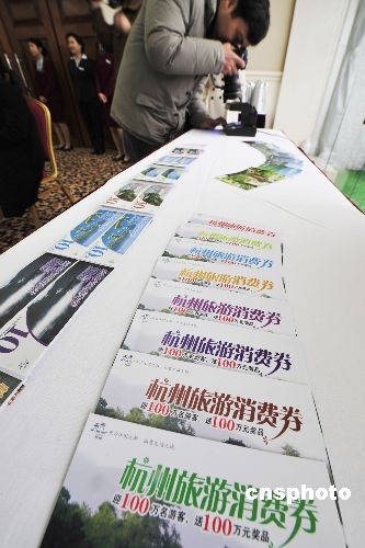 2月26日,杭州市宣布“杭州旅游消費券”發(fā)放及使用說明,并開始正式面向以長三角地區(qū)為重點的國內(nèi)及港澳臺旅游市場免費發(fā)放240萬份總面值為1.5億元的“杭州旅游消費券”,從2009年3月1日起至5月31日止,持券游客來杭旅游可在指定商家使用并享受相應的優(yōu)惠。 中新社發(fā) 李忠 攝