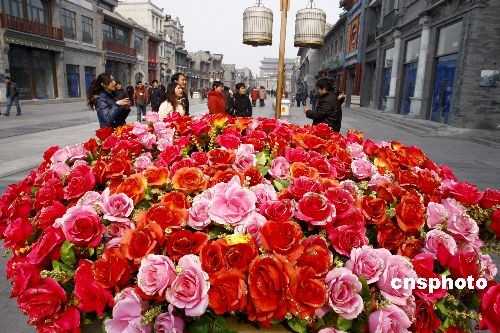3月3日,隨著“三八”婦女節(jié)的臨近,北京前門大街用多彩的“絹花玫瑰”來(lái)裝扮街景,市民和游客提前感受到濃濃的節(jié)日氣氛。中新社發(fā) 鄭雄增 攝