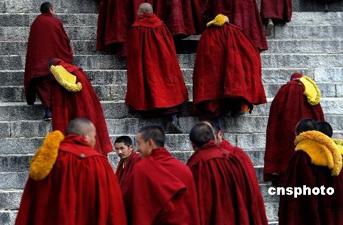 3月4日,中國藏歷新年正月初八,西藏拉薩哲蚌寺舉行傳昭大法會,該寺僧人辯經(jīng)結束后進入措欽大殿。中新社發(fā) 廖攀 攝