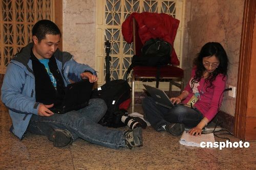 3月5日,十一屆全國人大二次會(huì)議在北京人民大會(huì)堂開幕。圖為在大會(huì)堂走廊上,采訪大會(huì)的記者席地而坐,爭取以最快的速度傳送稿件。中新社發(fā) 張婭子 攝