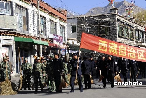 3月7日,西藏民警在拉薩東城清掃街道,為民眾服務(wù)。中新社發(fā) 廖攀 攝