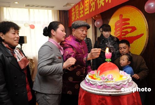 3月13日,安徽六安市為全國勞動模范宋克臣祝賀80壽辰。宋克臣1948年參加革命,1958年,他發(fā)明轟動全國的自動售糧器;2008年汶川地震發(fā)生后,他把自己發(fā)明的《高層建筑應急逃生裝置》專利無償捐獻給國家。60年來,宋克臣通過刻苦自學,共發(fā)明創(chuàng)造45項各類實用技術,成為遠近聞名的勞模發(fā)明家。中新社發(fā) 陳超平 攝