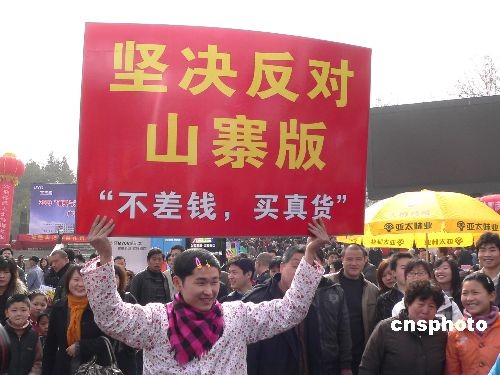 3月15日,在鄭州紫荊山廣場3·15活動現(xiàn)場,“山寨版”小沈陽將“堅決反對山寨版”的牌子高高舉起,倡導民眾買真貨。中新社發(fā) 王中舉 攝
