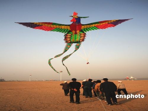 3月18日下午,一只巨型鳳凰風(fēng)箏在臨沂城區(qū)段沂河岸邊起飛,引來許多市民觀賞 。這只風(fēng)箏由臨沂鳶友俱樂部楊寶玉主任設(shè)計(jì)并同風(fēng)箏愛好者耗時(shí)兩個(gè)多月制作完成。該風(fēng)箏長(zhǎng)65.8米,雙翅展距20.4米,用碳素鋼管和防雨綢扎制,是目前世界上軟翅類最大的風(fēng)箏,他們準(zhǔn)備在4月份攜帶該風(fēng)箏參加第26屆濰坊國(guó)際風(fēng)箏節(jié),一展臨沂風(fēng)箏愛好者風(fēng)采。 中新社發(fā) 梅魯生 攝