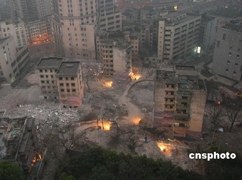 2009年3月21日,重慶江北區(qū)觀音橋處成功進(jìn)行了危舊房定向爆破。當(dāng)日早晨8時(shí),一聲巨響,當(dāng)?shù)赜灞倍宥柕貕K的6棟樓房被爆破拆除,總面積1000平方米。這是重慶2009年危舊房改造的第一爆,是觀音橋商圈快速推進(jìn)“長江上游商貿(mào)中心”的重要舉措。中新社發(fā) 賀終榮 攝
