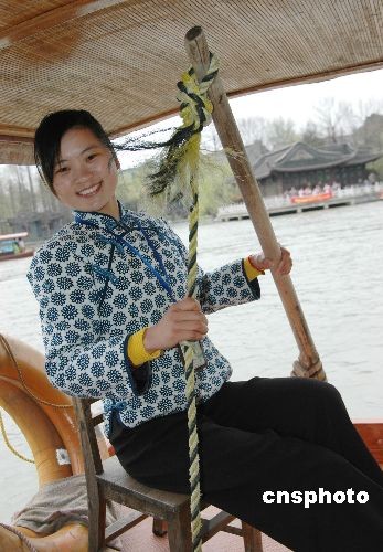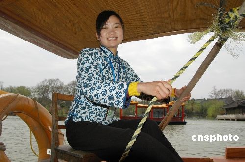 3月31日,大學(xué)生“船娘”唐紅梅在揚(yáng)州瘦西湖上搖櫓。畢業(yè)于蘇州經(jīng)貿(mào)學(xué)院的唐紅梅在08年底應(yīng)聘為江蘇揚(yáng)州瘦西湖上的“船娘”,經(jīng)過近三個月的崗前培訓(xùn)正式上崗,現(xiàn)在她每天在自己的擼船上漾湖水吟小調(diào),贏得游客叫好,也為瘦西湖平添一道風(fēng)景。中新社發(fā) 張丙濤 攝