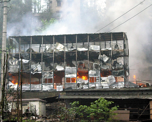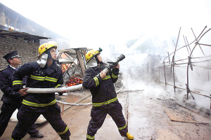 上午9點(diǎn)10分,火勢(shì)基本被控制。記者看到,1號(hào)樓已完全垮塌。1號(hào)樓前的3號(hào)樓只剩下了空架子;1號(hào)樓后民工食堂搭起的一個(gè)簡(jiǎn)易棚也遭燒光,大火順著簡(jiǎn)易棚的頂部,蔓延到了堡坎上的一排磚瓦結(jié)構(gòu)平房。
