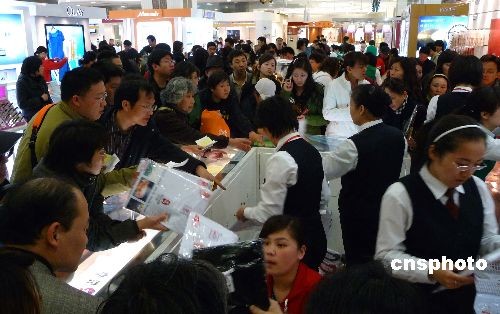 2009年3月31日,北京王府井奧運(yùn)特許商品店,顧客竟相搶購各類奧運(yùn)紀(jì)念品。當(dāng)日,手提大包小裹奧運(yùn)紀(jì)念品的人們成為金街一道靚麗風(fēng)景。按照相關(guān)規(guī)定,奧運(yùn)特許商品銷售日期截止到31日24時(shí)。北京一些大型商場內(nèi)的奧運(yùn)特許商品銷售點(diǎn)紛紛以超低價(jià)格進(jìn)行拋售。中新社發(fā) 玉龍 攝