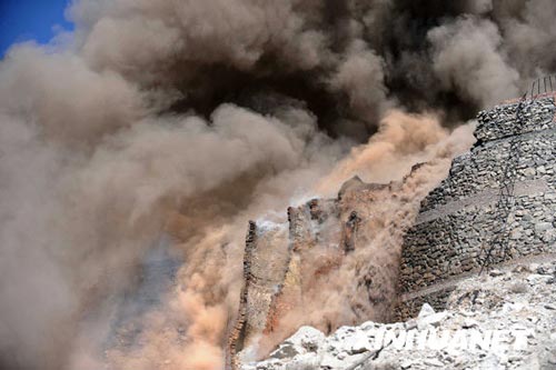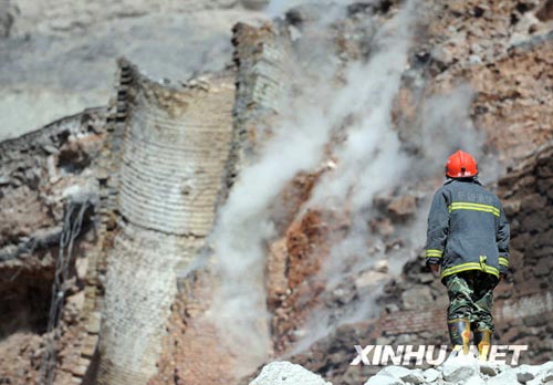 目前,救援工作仍在進(jìn)行中。由于石灰窯窯口前的臺(tái)地面積很小,且有一條大裂縫,消防車一時(shí)難以駛?cè)耄幌廊藛T用高壓水槍作業(yè)時(shí),水一噴上去窯體即不斷塌方,救援難度較大。