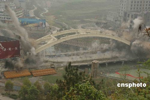 4月5日,在“5.12”汶川大地震中損壞的重慶市黔江區(qū)黔州大橋被成功爆破。黔州大橋于1997年建成,去年“5.12”汶川大地震后,大橋的拱肋、橋面及橋墩等多處出現(xiàn)裂痕,吊桿松動嚴(yán)重,當(dāng)?shù)卣扇∠薷叩刃问浇箍拓涊d重車通行,并進(jìn)行監(jiān)測。2009年初,經(jīng)專家勘測、檢驗(yàn),決定拆除該橋。中新社發(fā) 阮守軍 攝