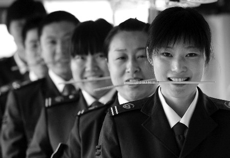 15日,濟(jì)南10路公交車駕駛員咬著筷子練習(xí)微笑服務(wù)。當(dāng)日,為給乘客提供微笑服務(wù),該車隊(duì)對駕駛員進(jìn)行“笑臉迎全運(yùn)”培訓(xùn),按照標(biāo)準(zhǔn)進(jìn)行練習(xí),要求只能露出6到8顆牙齒,為達(dá)要求,司機(jī)在訓(xùn)練微笑時(shí),都會咬著一根筷子。(本報(bào)記者 王鴻光 通訊員 吳林 攝)