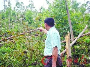 “半夜聽到呼呼的風(fēng)聲,隱約看到有白影在移動(dòng),接著冰雹就砸下來了!碑(dāng)夜正在值守的中興村村委會(huì)書記馮文安回憶道。昨日凌晨2時(shí)50分至3時(shí)10分,一股強(qiáng)勁的龍卷風(fēng)在臨田村北部的山林出現(xiàn),從臨田村村邊的水田和果林掠過。