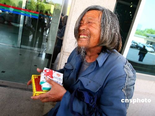 4月30日,曾在去年四川汶川地震后捐款三次的南京乞丐徐超近日被一名不愿意透露姓名的男子接到北京,為他安排住處、做體檢并協(xié)助在北京找工作。2008年5月17日,南京江寧街頭,乞丐徐超掏出5元人民幣放進(jìn)募捐箱;當(dāng)天下午,徐超特意去銀行將討來(lái)的零錢(qián)換成整錢(qián),又將100元塞進(jìn)募捐箱;5月19日,徐超再次捐款339.01元。中新社發(fā) 富田 攝