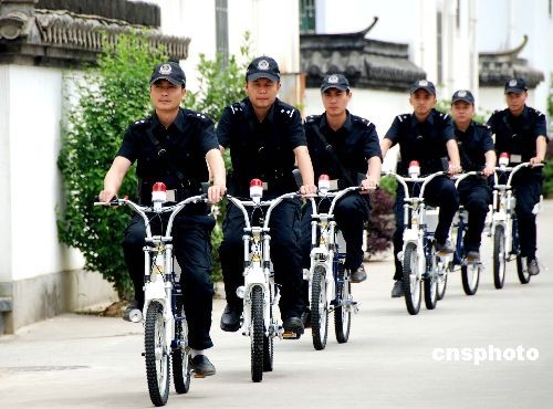 5月5日,江西婺源的大街小巷的城區(qū)出現(xiàn)了一支特警自行車治安巡邏隊。他們騎乘統(tǒng)一配發(fā)的輕便自行車,車前掛有“巡警110”標志,車后配備便民服務箱。為群防群治,共織平安網(wǎng),婺源縣公安局特警大隊由60人組成的一個特色 “警務自行車巡邏隊”,以適應該縣轄內(nèi)小街巷多、警車巡邏不易覆蓋的治安特點。同時利用自行車巡邏既環(huán)保、便捷、無噪音,又可增加古城小道的見警率,還避免了機動車頻繁流動造成的道路擁堵, 大大提高“走街串巷”治安巡防的效率,延伸了公安機關對社會面的防控觸角。 中新社發(fā) 王國紅 攝
