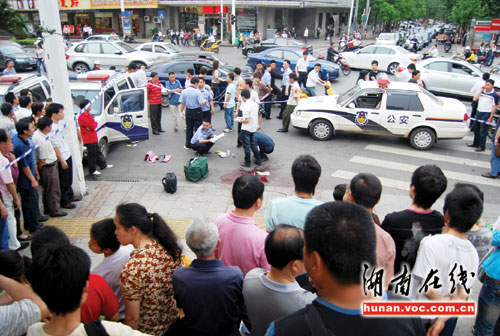 住在離事發(fā)地點100米不到的文冬輝先生看到事發(fā)的全過程:“造成這起血案的人都是在后面的‘一家子菜館’做事的,其中一人脖子上中了一刀,鮮血直冒,被120急救車送往長沙市一醫(yī)院了,兇手逃向市博物館,被博物館的保安當(dāng)場抓獲!