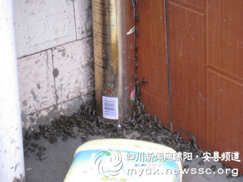 今日上午7點,本網(wǎng)接到熱線反映,安縣桑棗鎮(zhèn)香溪村4組的席興國家周圍出現(xiàn)密密麻麻的蟾蜍,有上百萬只。9點過,當(dāng)記者敢到現(xiàn)場,只見席興國的房屋周圍以及隔壁鄰居家前前后后全布滿了小拇指般大小的灰黑色蟾蜍。除了壩子中間的蟾蜍比較稀疏外,路上、墻角等地比較陰暗的地方,出現(xiàn)蟾蜍蜂擁、扎堆現(xiàn)象。席興國指著被踩死的蟾蜍說:“根本沒法下腳,一腳下去就是十幾個。你看,我們走過的地方,都是蟾蜍的尸體。”