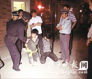 記者趕到現(xiàn)場(chǎng)時(shí),兩名年輕男子雙手被反綁,跪在小區(qū)門口不敢動(dòng)彈,他們的臉上有多處傷痕。兩名男子四周站滿了小區(qū)業(yè)主,面對(duì)大家的指責(zé),他們低下了頭,不斷求饒,讓大家放他們一馬。據(jù)一名小區(qū)保安介紹,當(dāng)晚,他和另外一名保安在門衛(wèi)室值勤。到了9點(diǎn)半時(shí),他發(fā)現(xiàn)兩名陌生男子推著一輛自行車從小區(qū)內(nèi)走來(lái),兩人還邊走邊四處張望。他覺得對(duì)方可疑,當(dāng)即喊上一名同事上去盤問。經(jīng)盤問,兩名男子并不是小區(qū)業(yè)主,也無(wú)法說(shuō)出來(lái)小區(qū)的目的,對(duì)于自行車的來(lái)歷,更是支支吾吾。細(xì)心的保安發(fā)現(xiàn)自行車鎖有明顯被撬痕跡,當(dāng)即斷定兩人是偷車賊,于是,當(dāng)場(chǎng)將這兩人按倒,同時(shí)呼叫其他保安增援。小區(qū)業(yè)主孫先生說(shuō),兩名偷車男子被揪住后不一會(huì)兒,就哭著求饒了,并主動(dòng)承認(rèn)他們是來(lái)小區(qū)偷自行車的,也表示將自行車歸還,希望保安放他們一馬。兩保安見那兩男子服軟了,才停手,但他們沒有立即報(bào)警,而是找來(lái)繩子將兩名男子雙手反綁在背后,然后脫去他們的鞋子,逼迫他們跪在門衛(wèi)室門口。