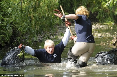 約翰遜當(dāng)時(shí)正在和志愿者們一同為倫敦東南部的普利河清除垃圾,穿著防水長(zhǎng)靴、戴著橡膠手套的他在靠近岸邊的淺水區(qū)忙得不亦樂(lè)乎。在攝像機(jī)面前擺出各種姿勢(shì)后,約翰遜突然被一個(gè)水洼絆倒,并跌倒在河水中。3名志愿者見勢(shì)沖了過(guò)去,用一根竹竿奮力將他拖出水面。