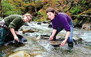 黛西便鼓動馬丁跟她一起去淘金, 以打造一對婚戒。說干就干,黛西和馬丁前往威爾士西部重鎮(zhèn)多爾蓋萊,在那里他們找到了一條有含金沙土的河流。在黛西的帶領(lǐng)下,他們在淺水河灘上挖了很多坑,淘出沙土用平底盤仔細(xì)篩查。